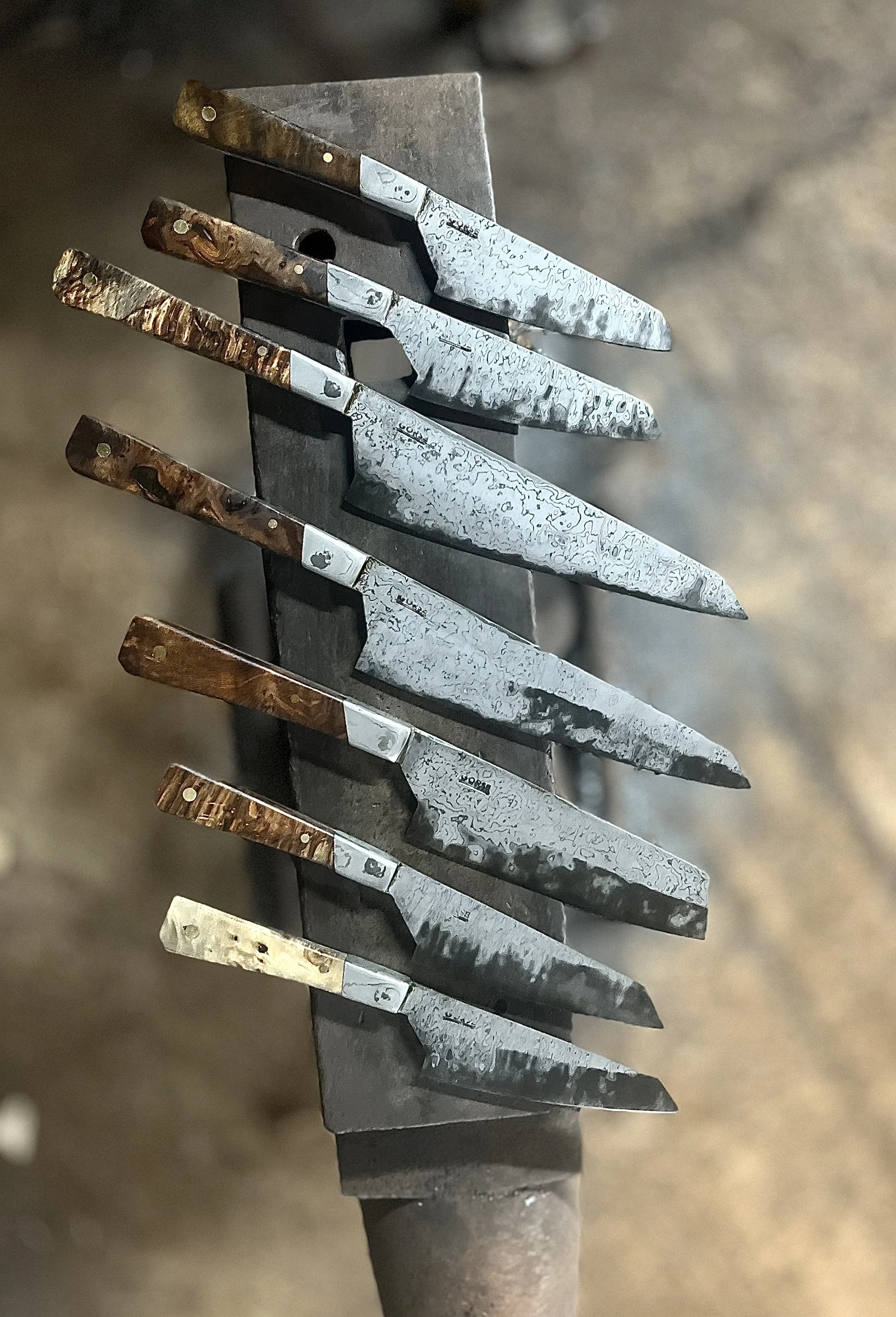 Gorse kitchen knives are painstakingly hand forged and crafted from Aogami laminated Japanese steel, wrought iron siding supports a harder high carbon steel blade. Instead of using awkward hidden tang handles, at Gorse Knives we use European style slab handles alongside Japanese inspired blades. Our handmade kitchen knives have sustainable walnut handles.